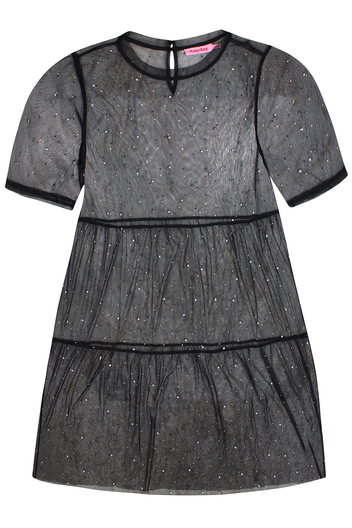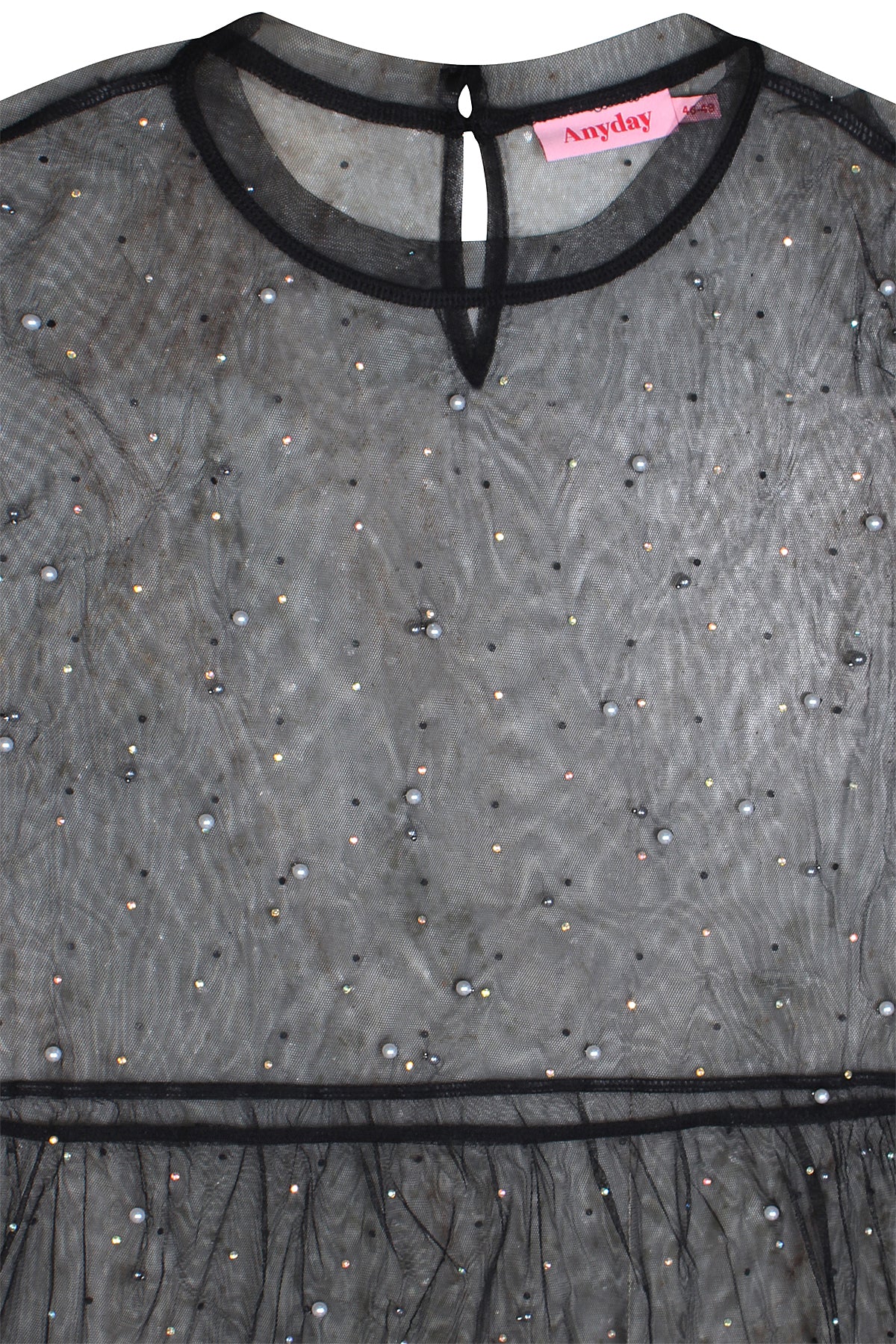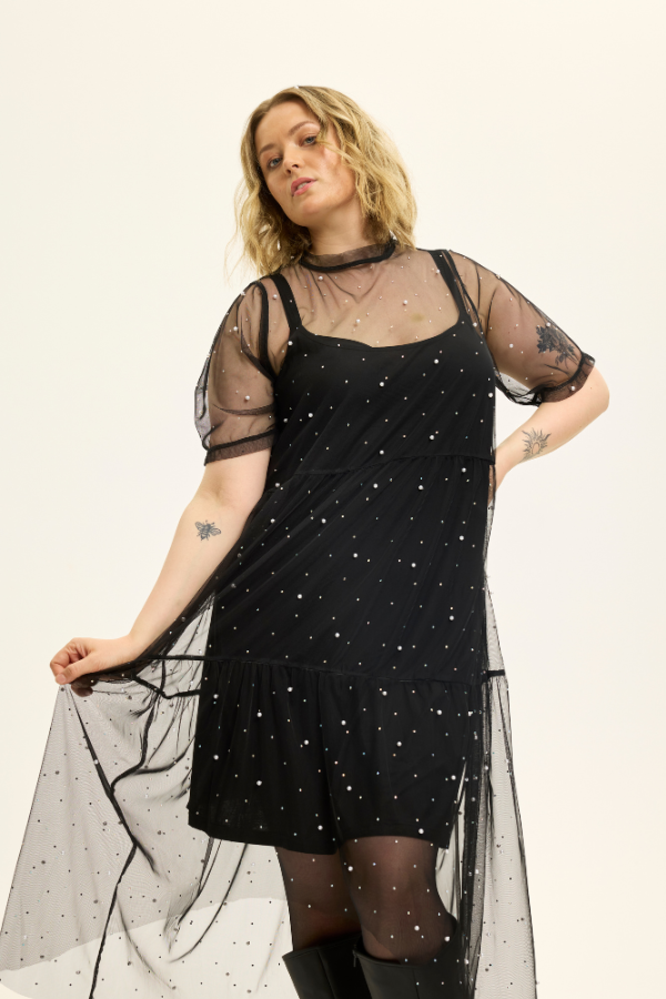 En let og elegant mesh kjole med rund hals og korte ærmer. Kjolen har fine flæselag forneden og er dekoreret med påsatte hvide perler og simili sten, der giver et eksklusivt og feminint udtryk.