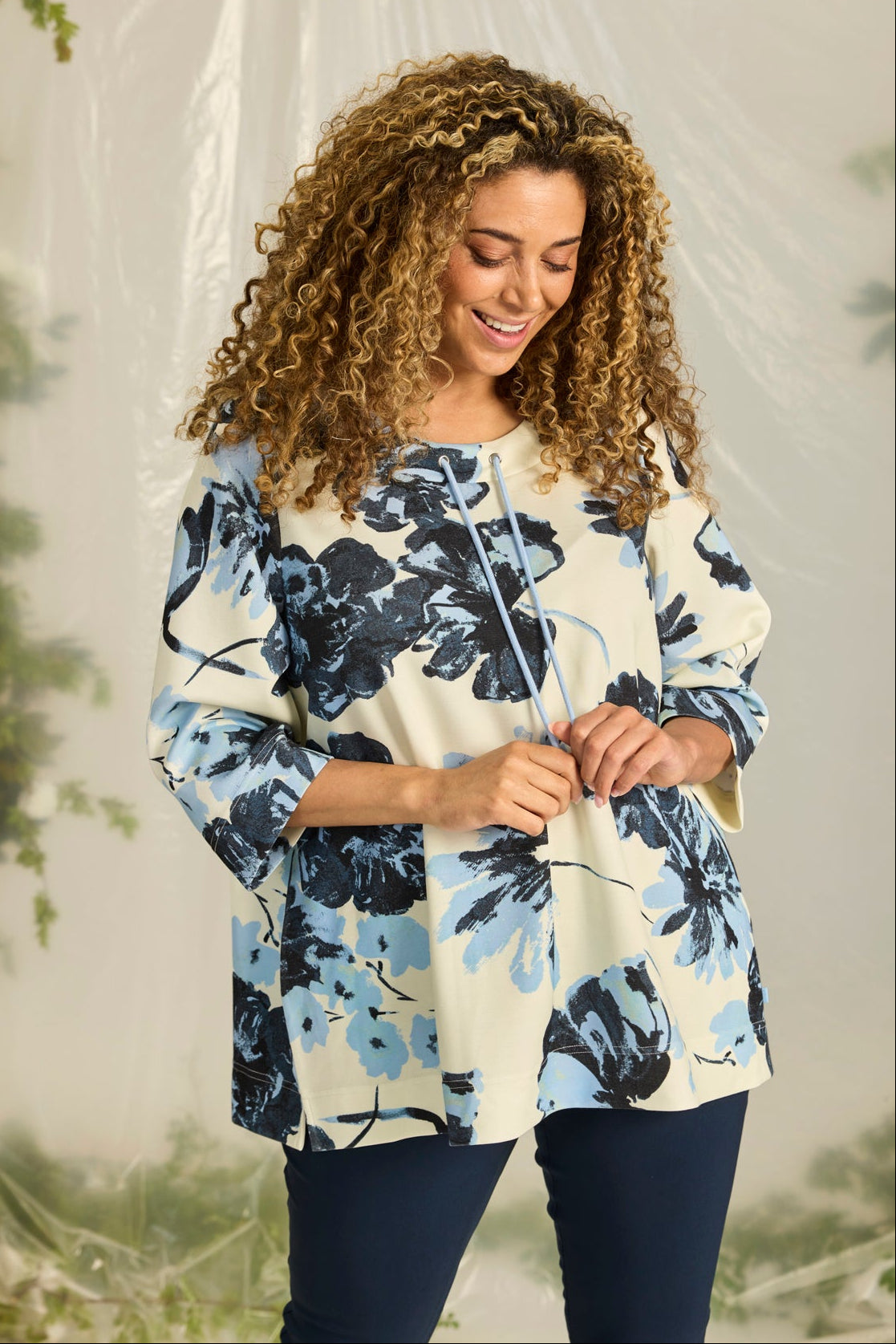 Mya sweatshirtbluse i flot blomsterprint. En fin og behagelig bluse i en lækker, blød kvalitet, som er skøn at have på hele dagen. Blusen har 3/4 lange ærmer og rund hals med bindebånd, der giver et feminint og afslappet udtryk. Den rummelige pasform giver god komfort og bevægelsesfrihed – perfekt til både hverdag og hygge.